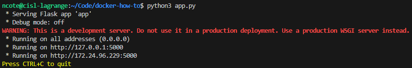 dockerapplication is called torunan image. -p 5000:5000maps port 5000 on your host to port 5000 inside the container (the port Flask listens on).ncote/docker-how-to:v1specifies the image to run.