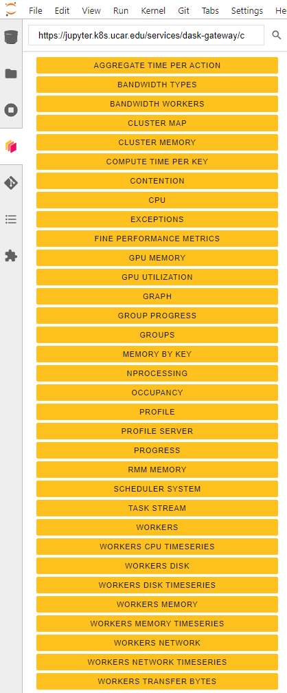 The Dashboard URL will bring you to a page where Dask cluster resources can be viewed in real time. The URL can also be copied and pasted into the Dask extension on the left as seen below.
