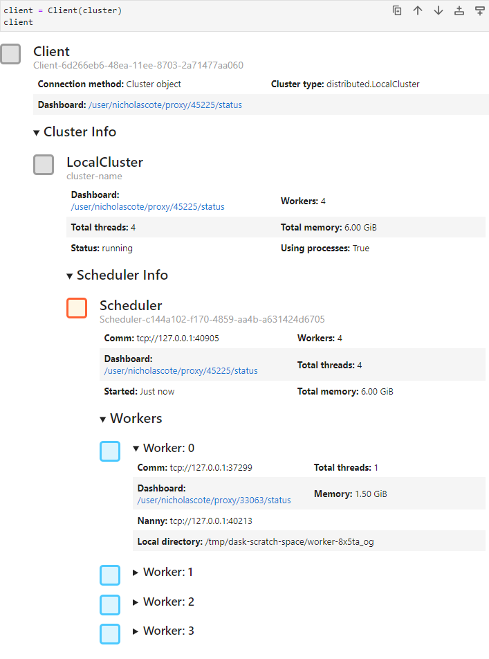 This creates a Dask cluster with 4 workers sharing your system's local resources. On NCAR's JupyterHub, running this will automatically display a Dask dashboard widget. The dashboard provides real-time insights into your cluster's activity.