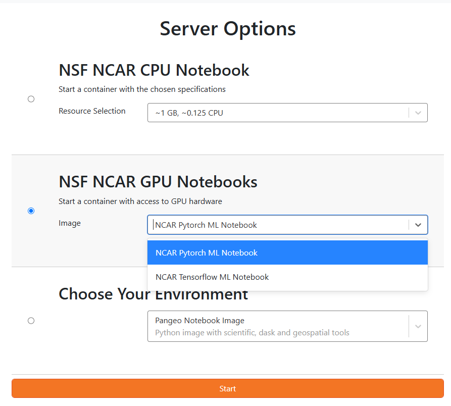 GPU support can be enabled by selecting a GPU-enabled image under Server Options when starting your JupyterHub server, as shown below: