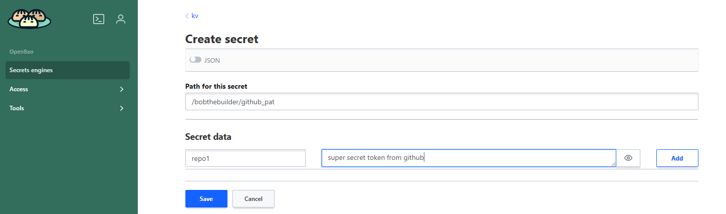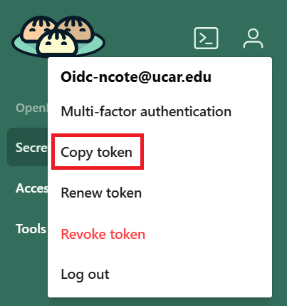 Copy your OpenBao token: Click the person icon in the upper left corner of the OpenBao interface and select "Copy token". Store this token in OpenBao under your personal path at your-email@ucar.edu/bao with the key "token" and your copied token as the value.