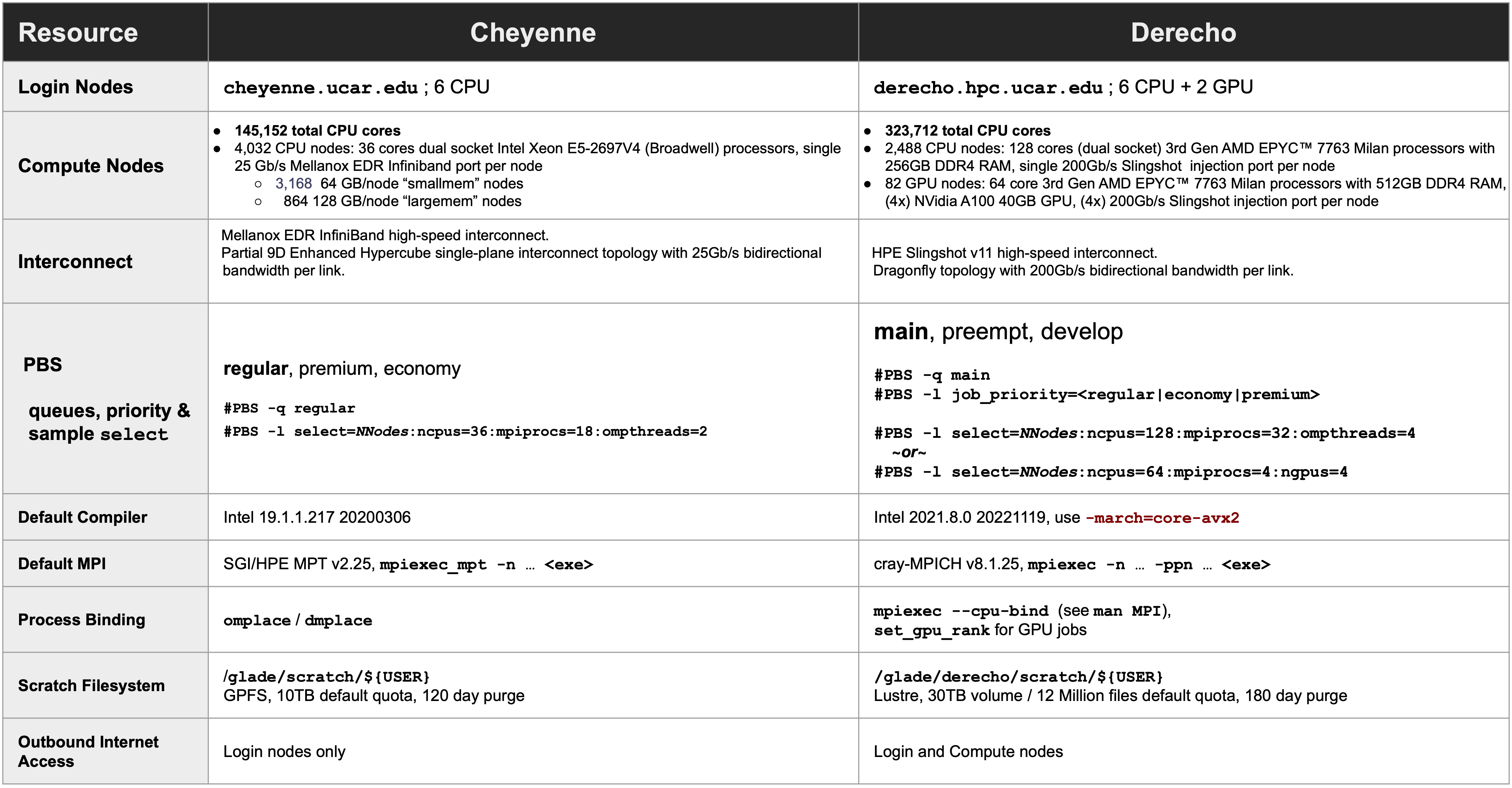 Click on the image below for a detailed comparison of Cheyenne and Derecho key user environment differences.