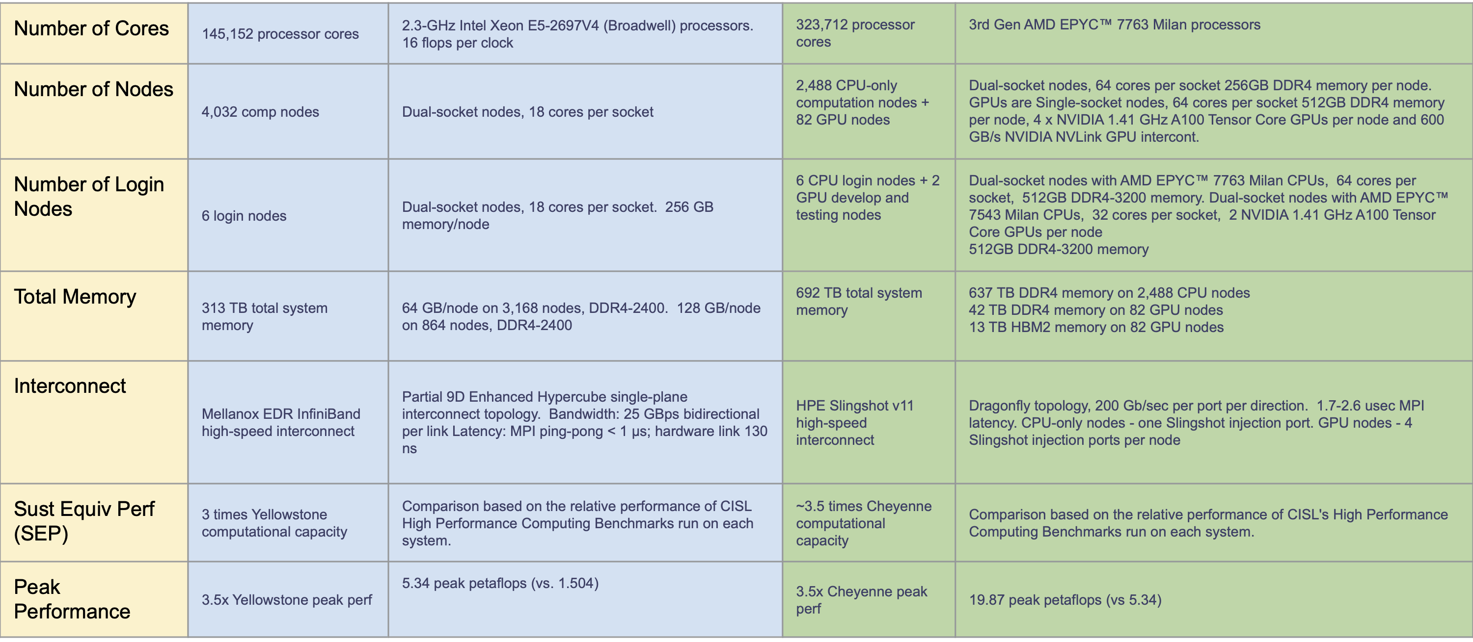 This page is intended to provide a high-level comparison of Derecho to Cheyenne, particularly for users comfortable with Cheyenne operations and looking for a reference guide for transitioning workflows.