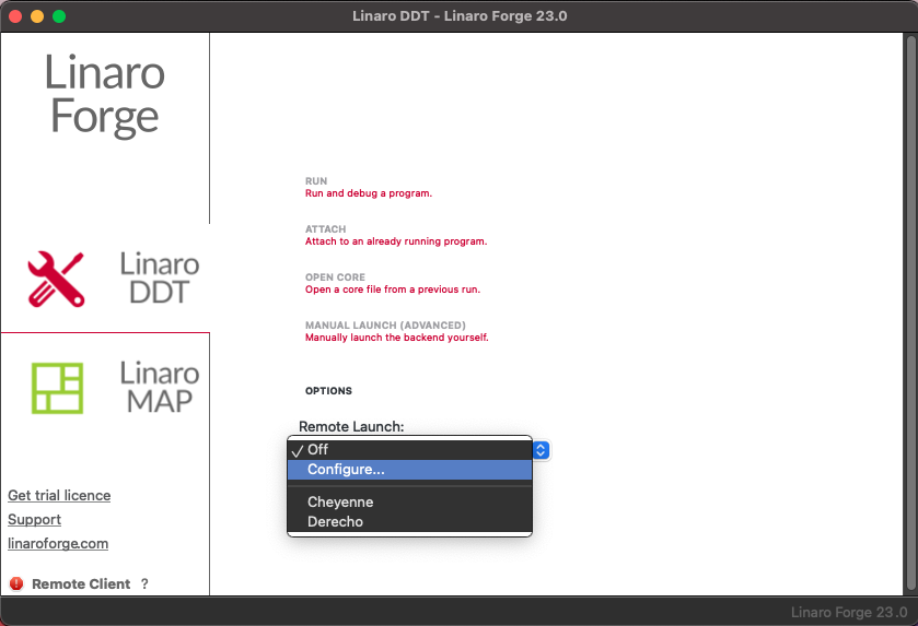 The client software version that you use locally and the server version that you use on Derecho must be the same. We recommend using the latest version available. Run module avail linaro-forge to identify the latest version.