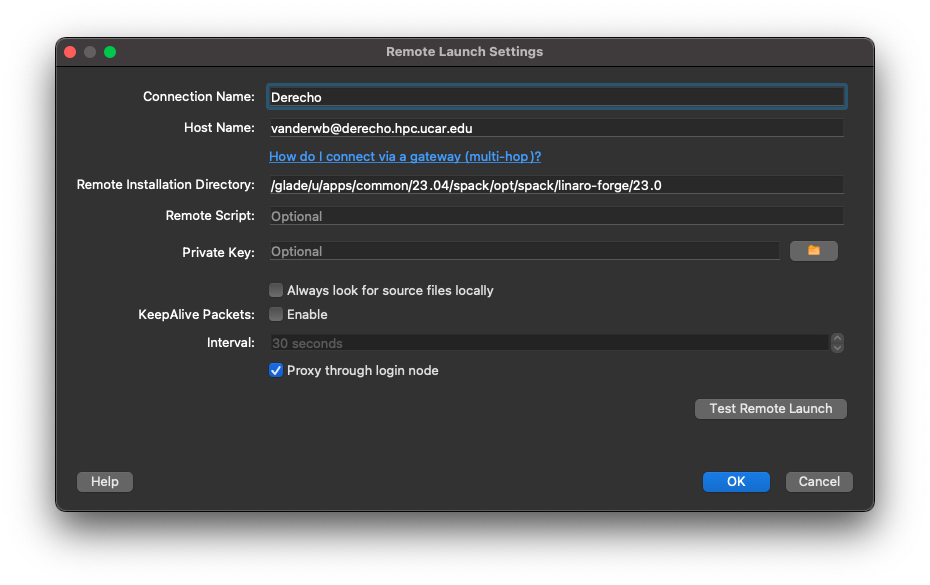 Enter your username followed by @ and the connection name (derecho.hpc.ucar.edu, for example) in the “Host Name” field.
