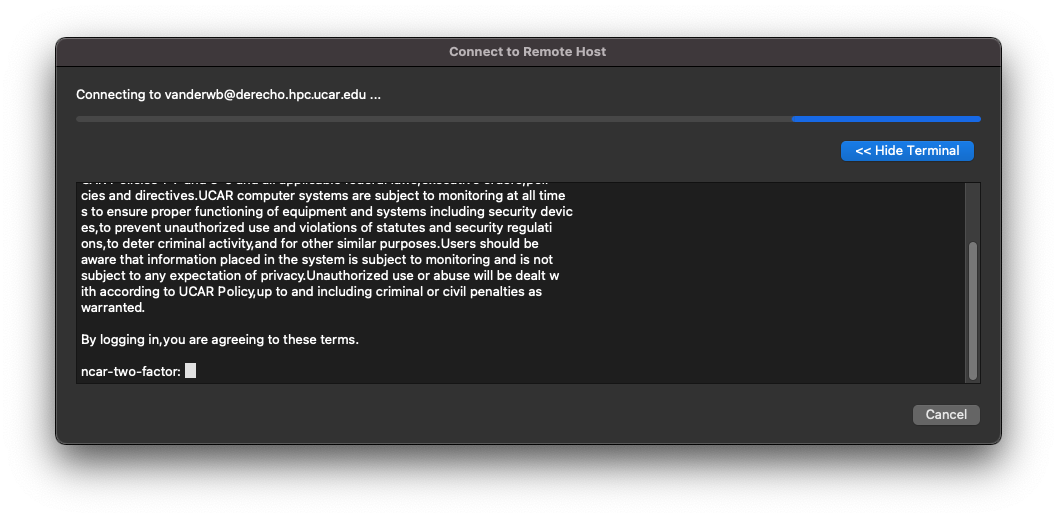 When the following dialog box appears, authenticate as usual. (It may be necessary to click Show Terminal to see the authentication window).