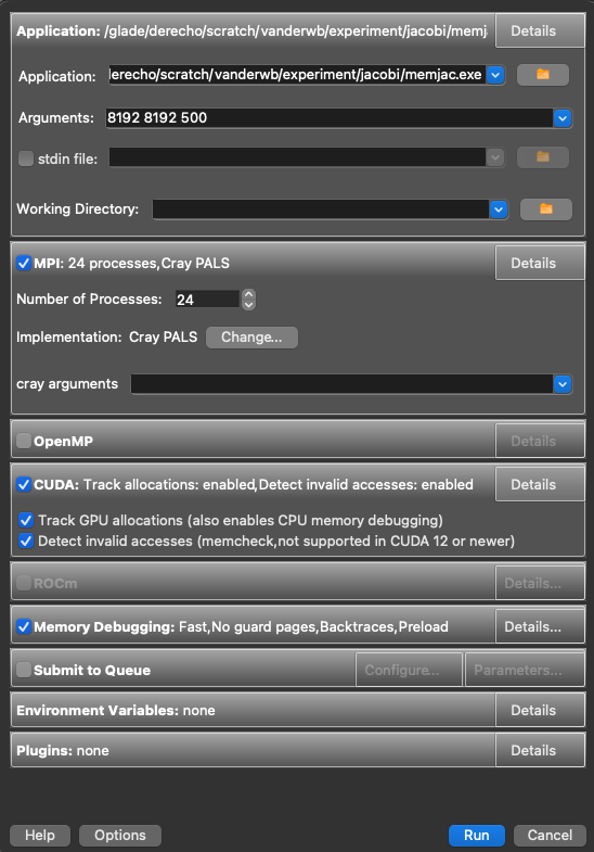 A “Run” window will open and display settings imported from your job script. Review the settings. If your program uses Cray MPICH, make sure the MPI is specified as Cray PALS where shown in the following image.