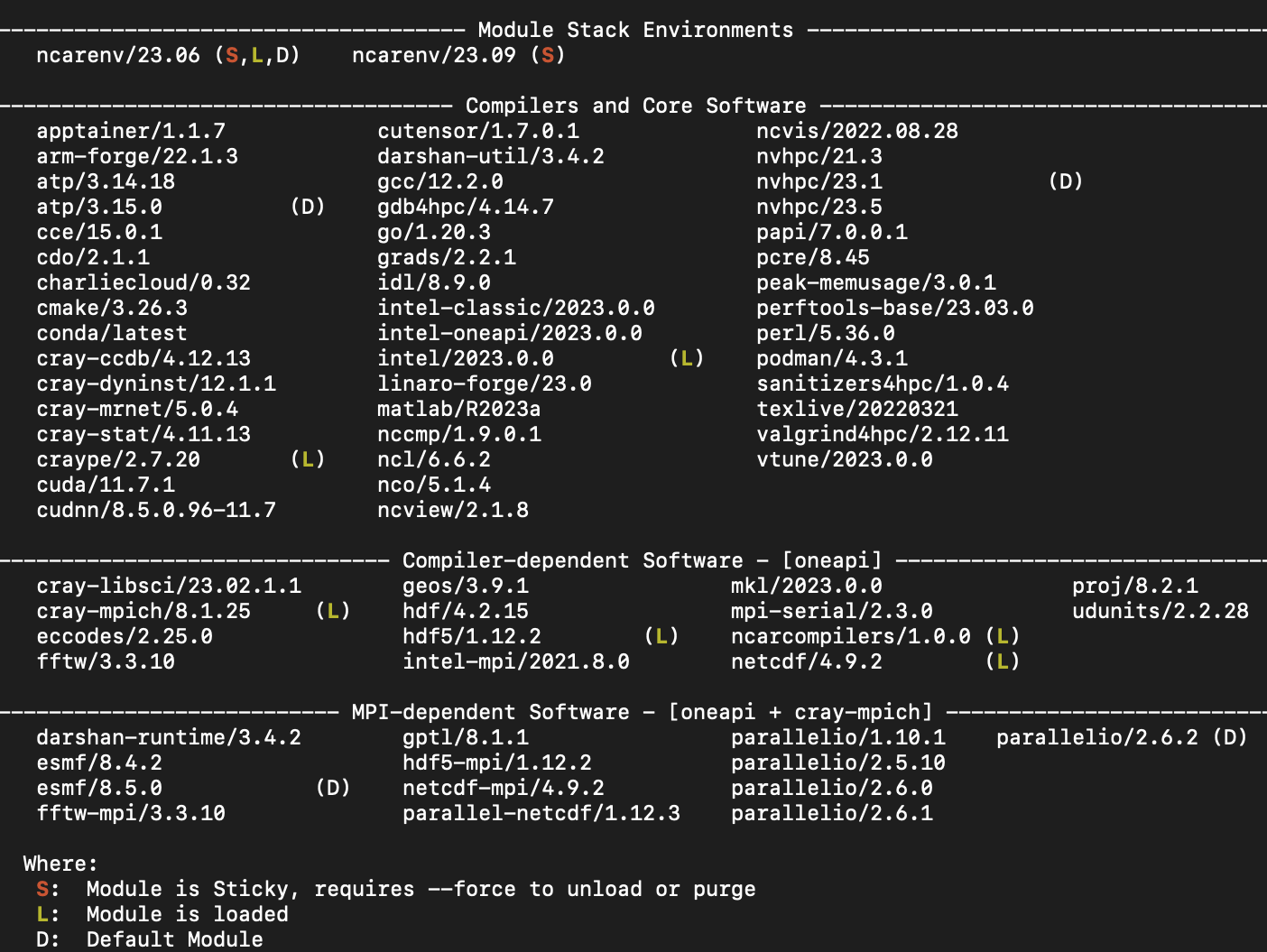 In the example above, (L) indicates which modules are currently loaded. The modules deployed at NCAR are hierarchical, with a base of common compilers and core software. The remainder of the output is dependent on what core software (namely, compilers) are chosen.