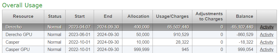 The overall usage report on project activity shows your allocations’ start and end dates, amounts allocated, and remaining balances.
