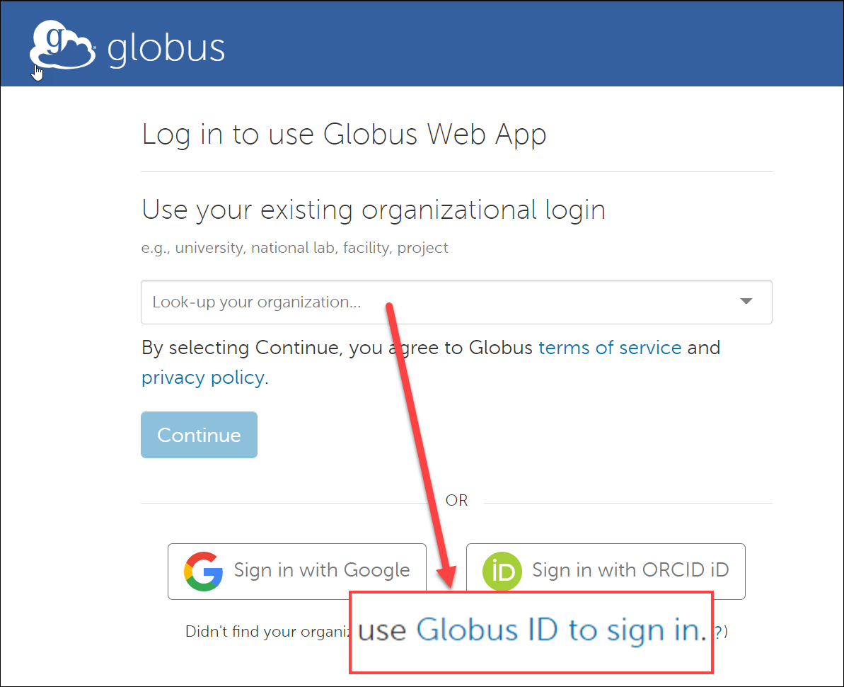 Go to the main Globus page (globus.org) and log in using your personal Globus ID.