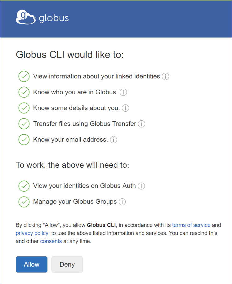Copy the lengthy URL and paste it into your browser. It will ask you to choose an identity – as above, use either a Globus ID or Google account – and then it will take you to a consent form that looks like this: