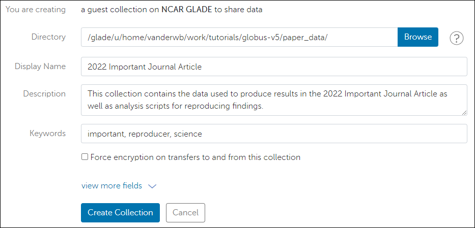 From the next screen, click Add a Guest Collection. This option will take you to the following page (sometimes after a one-time consent page), which allows you to name and customize your collection's metadata.