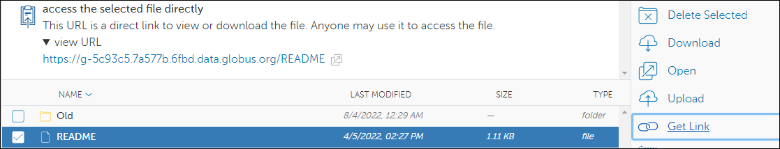 Once a guest collection is created, it can be used in place of a mapped collection as a transfer endpoint in the web interface, Globus CLI, or Globus Python API. Users can also bypass the Globus transfer interface entirely by creating a URL to an individual file contained within a guest collection. The URL will give specified individuals download access to the data from a browser or terminal utility like wget or curl.