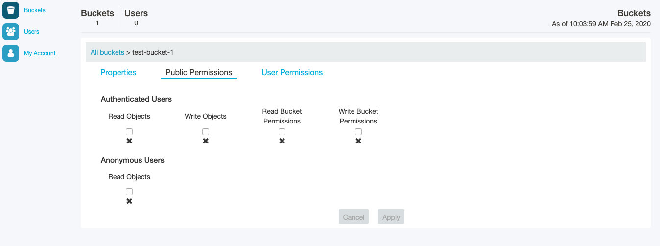 It's also possible to grant permissions to what are termed public users. A public user is defined as either an anonymous user or an authenticated user. An anonymous user means a user who does not need any keys to access the bucket; anonymous users can only read objects from buckets. An authenticated user means any user on the system. To grant permissions to public users, click on "Public Permissions" in the screen that was visited earlier and shown in Figure 6.